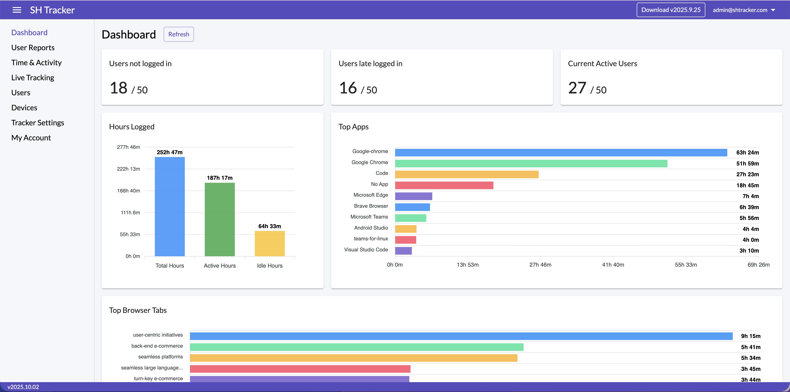 View real-time metrics, user activity, top applications, and detailed time logs all in one centralized interface.