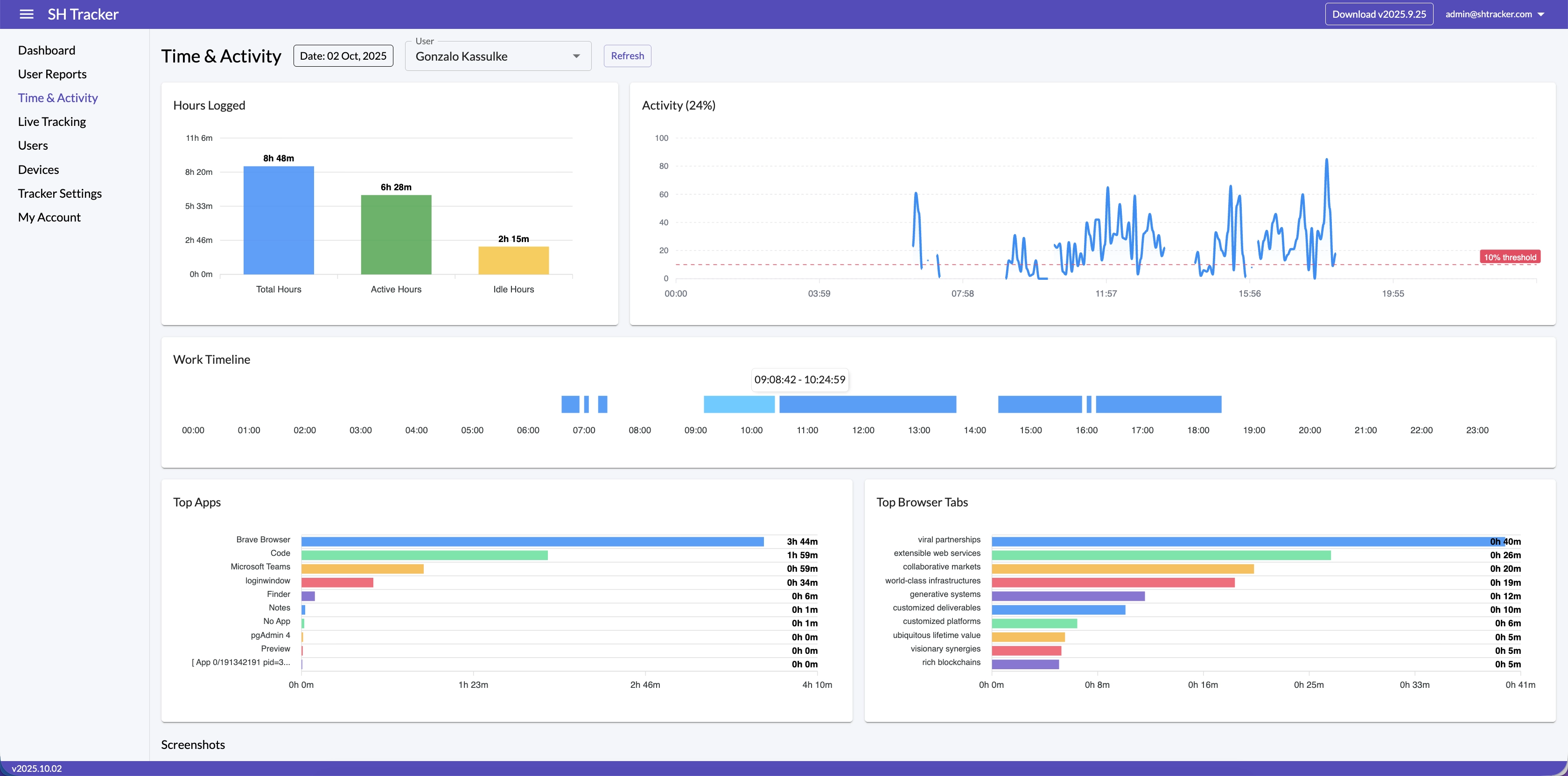 Visualize productivity with a Work Timeline, activity graphs, hours logged, top apps and browser tabs, plus archived screenshots for full verification.