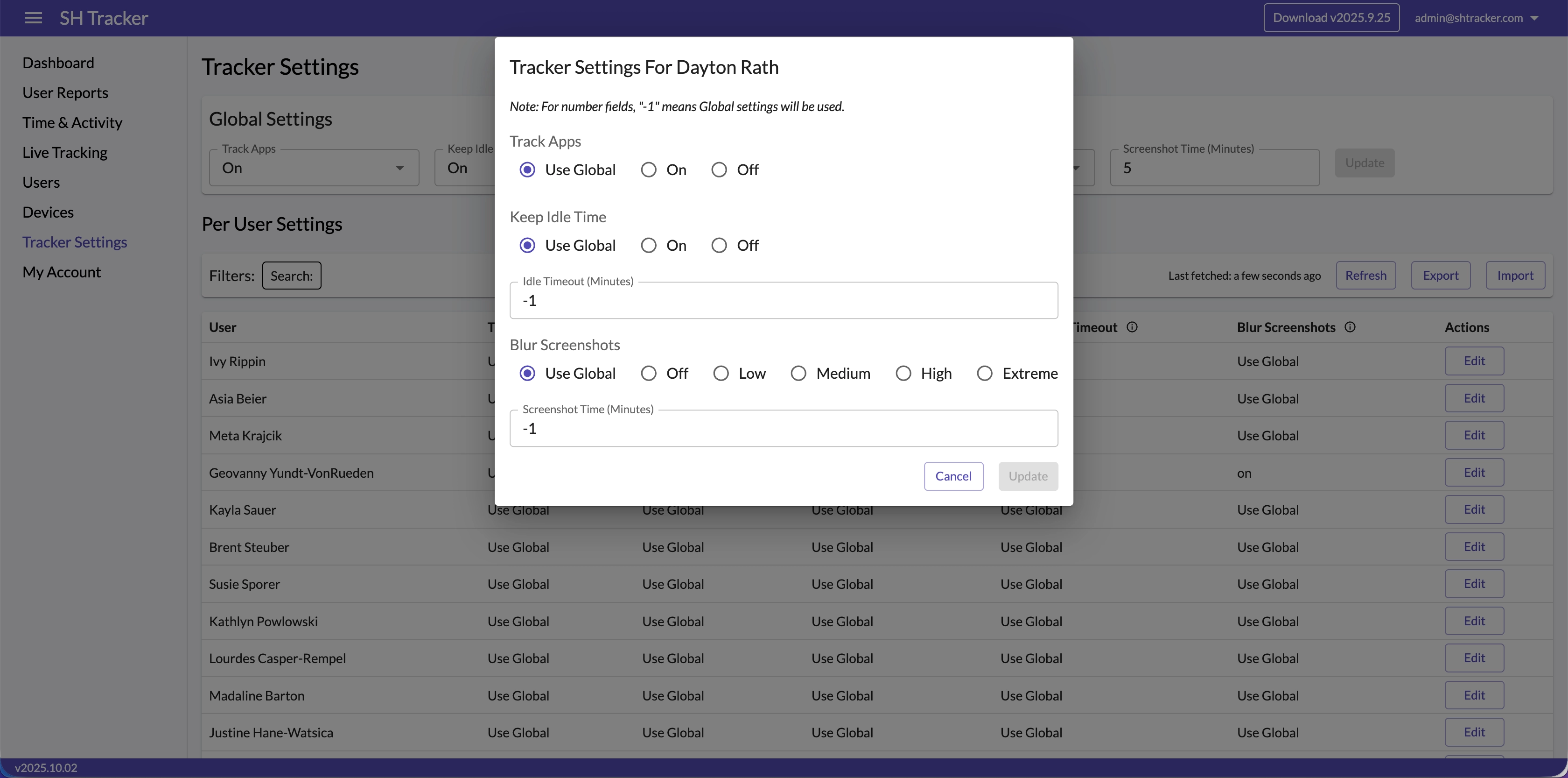 Configure global settings or customize tracking preferences per user, including app tracking toggles, idle time thresholds, and screenshot intervals.
