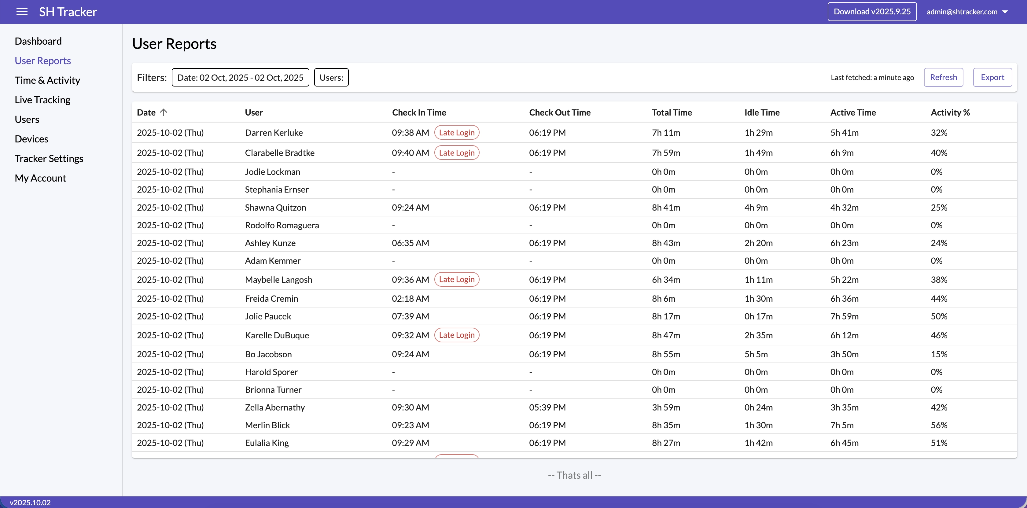 View real-time status of all employees including who's logged in, late logins, and current active users at a glance.